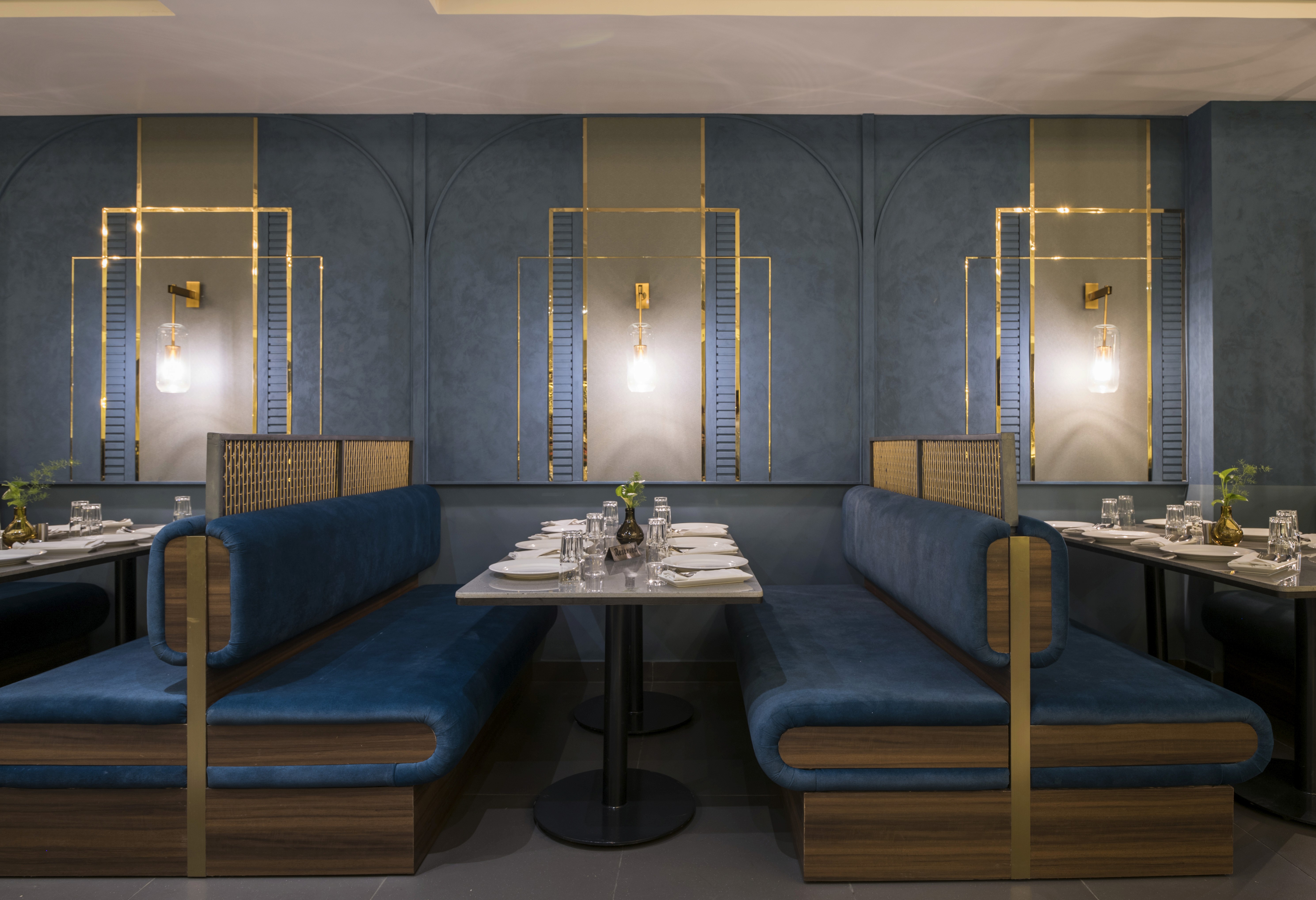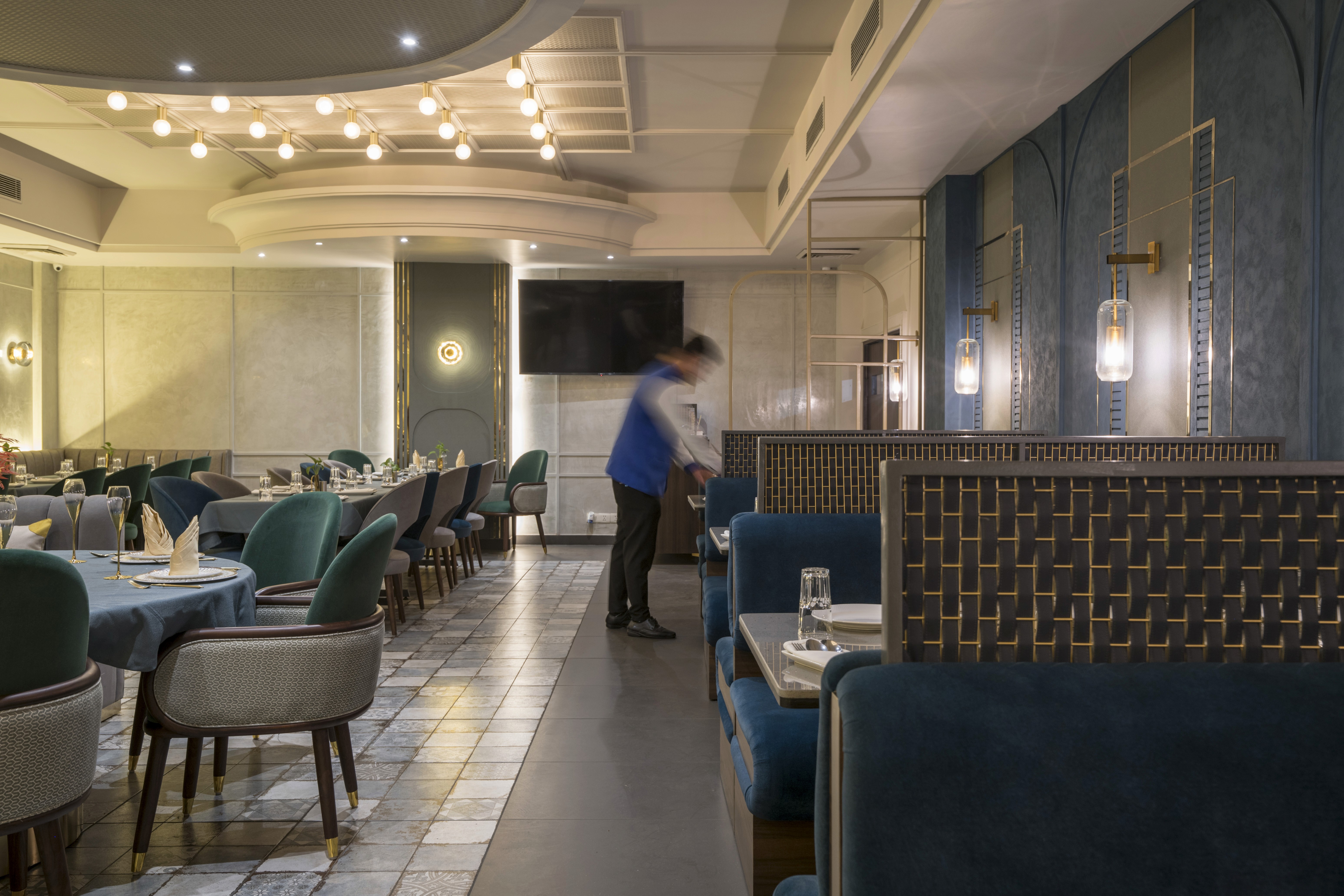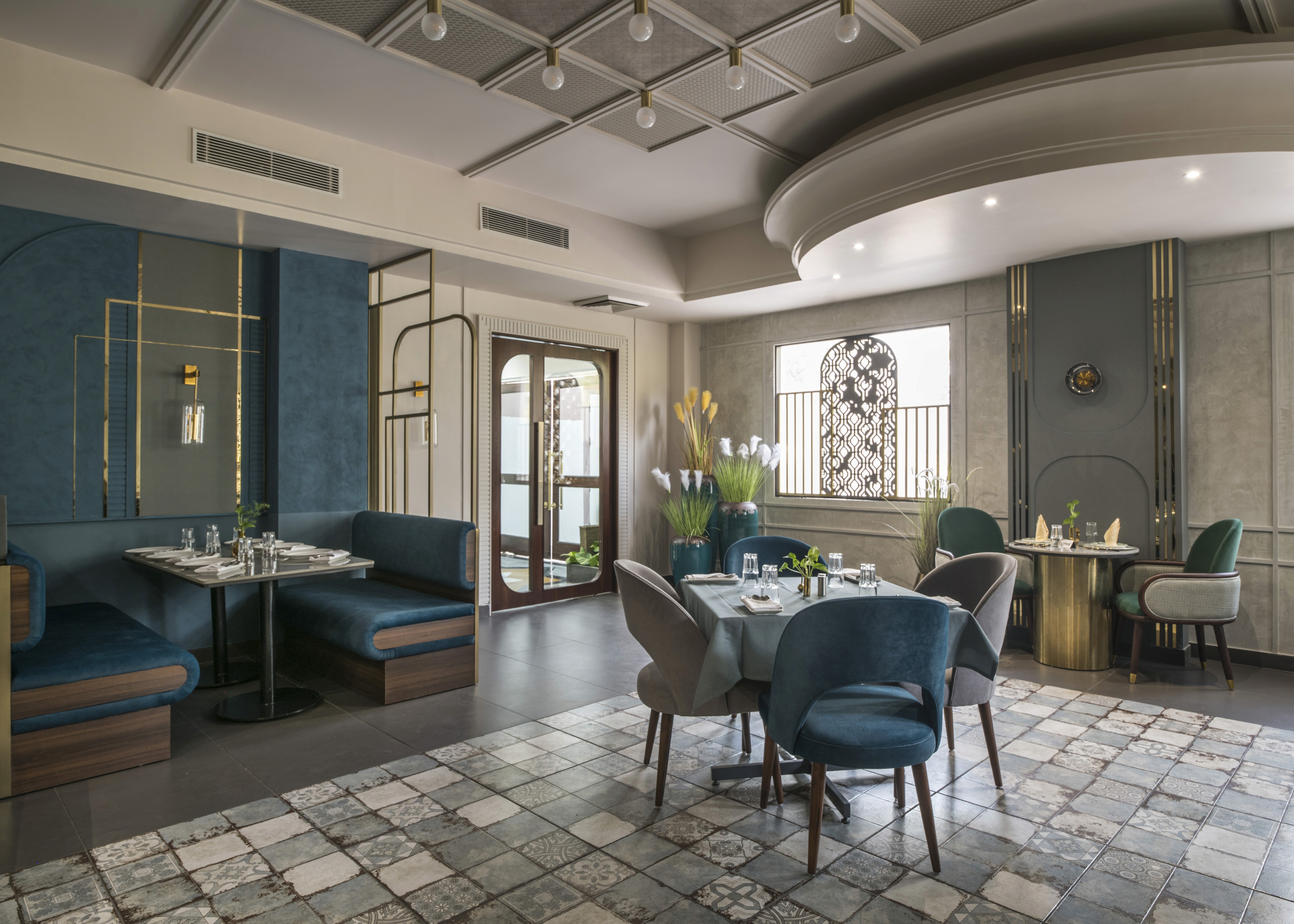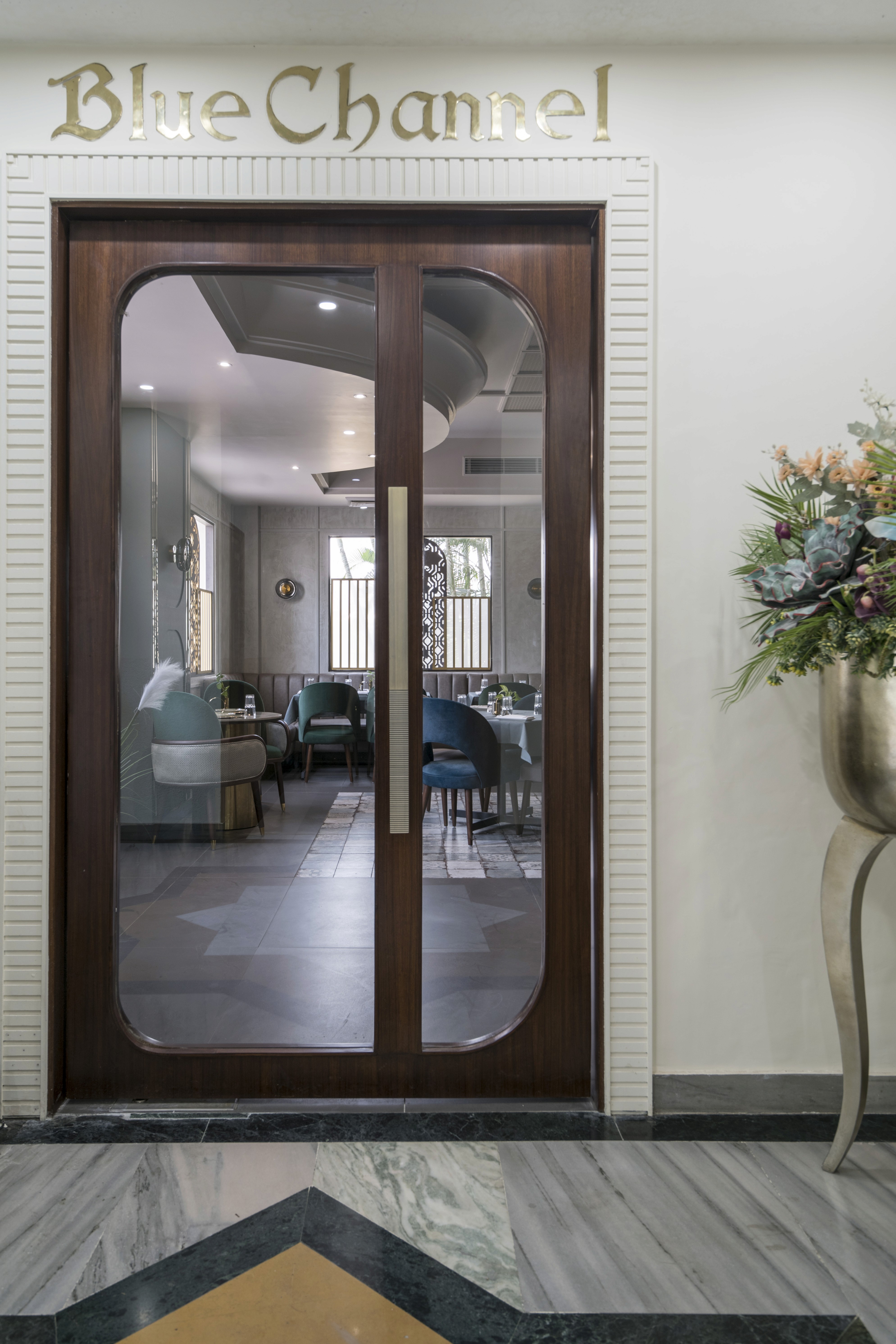 The Blue Channel is a fine dining restaurant that has been entertaining the great and the good, for more than 25 years. We redesigned the interiors keeping in mind the central theme of art deco and brand identity while providing it a fresh rejuvenating look. The restaurant offers a assorted sitting layout while the strong symmetry in the space leads to a comforting dining experience. The bar forms the focal point with accentuated lighting, marble finished counter, metal details and unique mid-century bar stools. The restaurant is a blend of contemporary and art deco elements and replete with textural play. Influenced by the hotel’s existing theme and the name Blue Channel, cosy booth sitting is created with splashes of blues in fabrics and wall panelling – complemented by arches, honed by marble table tops, gold accents and metal jaali’s. This together creates an overall experience that takes you back in the 1920’s era and serves you the class and richness.